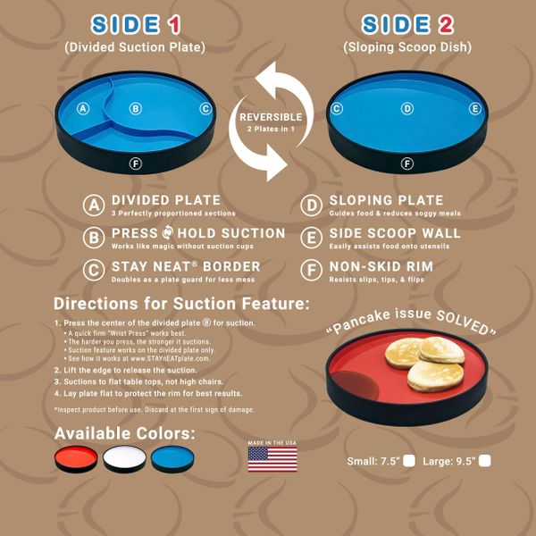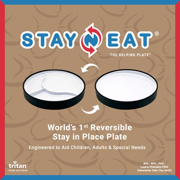 STAYnEAT plates are more stable, sturdy and durable than all others. The non-skid outer rim lays flat on the table. It eliminates any chance for tipping, flipping & slipping and is able to suction strong for extra stability.